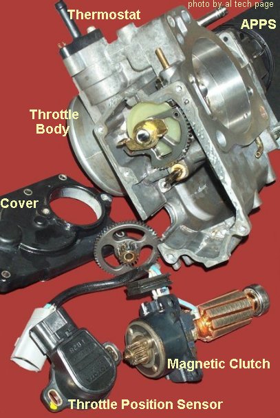 - Throttle Position Sensor (TPS) - датчик положения дроссельной заслонки используется для определения фактического угла её открытия. Напряжение этого датчика используется для осуществления обратной связи и проверки правильности функционирования. - Throttle Control Motor - обычный электродвигатель постоянного тока. ECM управляет направлением и током обмоток, изменяя длительность импульсов напряжения. При обнаружении неисправности в системе ECM блокирует управление приводом заслонки и электромагнитным сцеплением. Заслонка закрывается под воздействием возвратной пружины. При этом остается возможность открывания заслонки на небольшой угол за счет кинематической связи между (APPS) и заслонкой. - Magnetic Clutch - электромагнитное сцепление обеспечивает передачу движения от ротора привода к заслонке. Для снижения потребляемой мощности используется импульсное управление приводом заслонки. При возникновении неисправности в системе ECM отключает управление обмоткой сцепления. - Датчик температуры - термостат устанавливается в корпусе дроссельной заслонки и предназначен для управления протоком охлаждающей жидкости при значительном повышении ее темпратуры. Это предохраняет воздух поступающий во впускной коллектор от избыточного нагрева. В термостате используется восковый клапан. Fail-Safe mode ("Limp-mode") - при возникновении неисправности ECM зажигает лампу "Check Engine" и прекращает управление приводом и сцеплением заслонки. При этом возвратная пружина почти полностью закрывает дроссельную заслонку. В этой ситуации (limp mode) педаль газа может приоткрывать на небольшой угол заслонку лишь с помощью рычага limp mode. Таким образом уменьшается верхний предел скорости вращения (мощности) двигателя. Кроме того, отключаются системы ISC и Cruise Control.