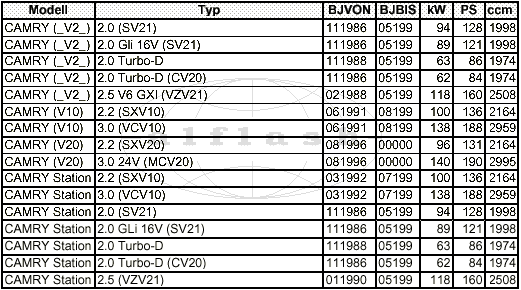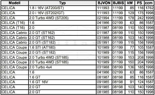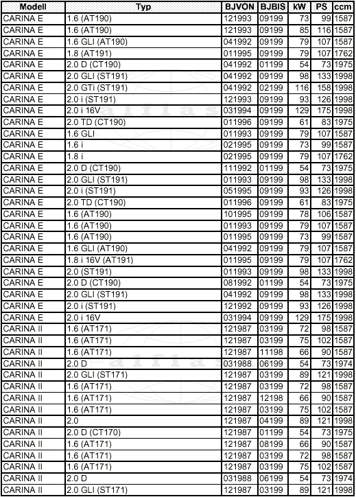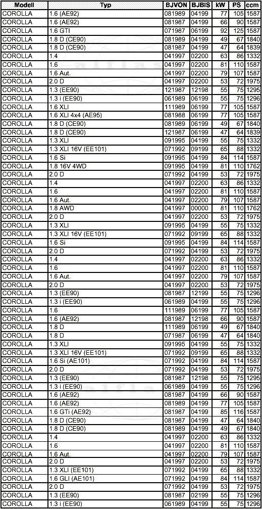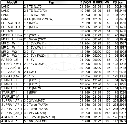 Мощность двигателей различных моделей TOYOTA (manufactured in Europe)