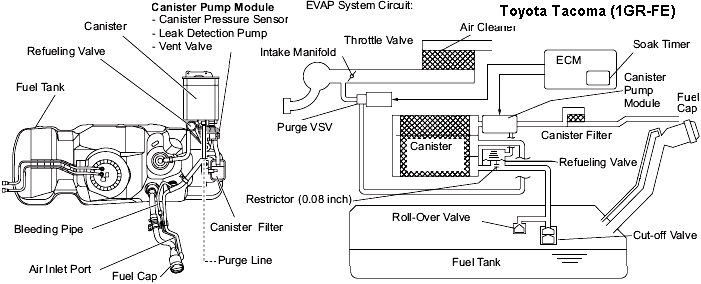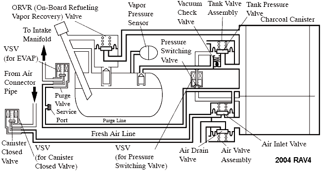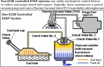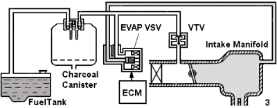 The old EVAP control system is a system which utilizes the intake manifold vacuum to draw the evaporative emissions into the intake manifold and mix then in with the intake air. The ECM controls a duty–cycle type VSV (vacuum switching valve) to purge the evaporative emissions from the charcoal canister.