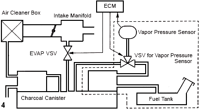The EVAP control system is a system which utilizes the intake manifold vacuum to draw the evaporative emissions into the intake manifold and mix them with intake air. The ECM controls a duty–cycle type VSV (vacuum switching valve) to purge evaporative emissions from the charcoal canister. The ECM uses the vapor pressure sensor to detect malfunctions in the evaporative emissions (EVAP) system. This diagnostic checks the function of the EVAP VSV and VSV for vapor pressure sensor, the integrity of these components and the fuel tank from the standpoint of fuel vapor emissions. When the VSV for vapor pressure sensor is closed, the ECM monitors the vapor pressure in the fuel tank. When it is open, the ECM monitors the vapor pressure in the charcoal canister. The ECM senses pressure in the fuel tank using the vapor pressure sensor. The ECM supplies the sensor with a regulated 5 V reference–voltage and the sensor returns a signal voltage between 0.5 V and 4.5 V according to the pressure level in the fuel tank. When the pressure in the fuel tank is low, the output voltage of the vapor pressure sensor is low. When it is high, the output voltage is high.