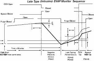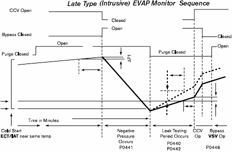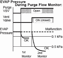 EVAP VSV Monitor (DTC P0441, im.4) In one part of this diagnostic, the ECM switches the EVAP VSV to apply manifold vacuum pressure to the EVAP system. The ECM then monitors the vapor pressure in the charcoal canister. It is normal for the vapor pressure decrease when the EVAP VSV is opened. If the ECM detects no reduction in vapor pressure it interprets this as a “stuck closed” malfunction in the EVAP VSV. In a second part of this diagnostic, the ECM checks the vapor pressure of the charcoal canister with the EVAP VSV off. If the vapor pressure of the canister remains low, the ECM interprets this as a “stuck open” malfunction in the EVAP VSV. In either case, the ECM will illuminate the MIL and set a DTC.