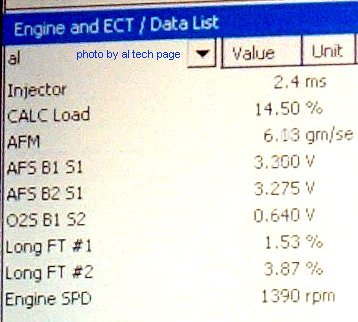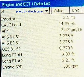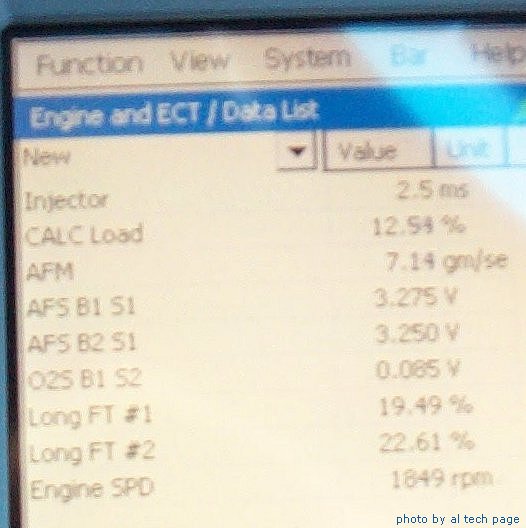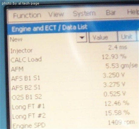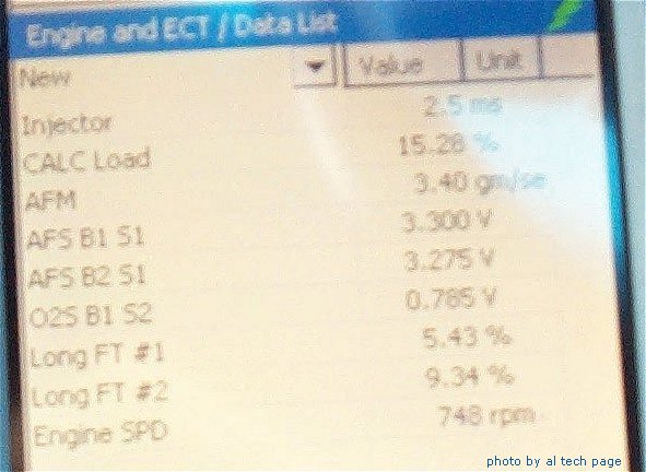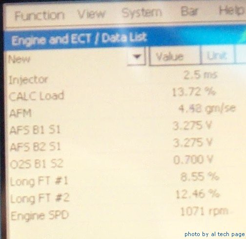 Наверняка, все уже догадались, что причиной происходящего была загрязненность чувствительного элемента (dirty) MAF Sensor'a. После его очистки: LFT#1=3.09 perc. и LFT#2=6.21 perc. at Idle; LFT#1=5.43 perc. и LFT#2=8.05 perc. at 1185 rpm (photo should be later). И при этом этот "хорек" начал "рвать из-под себя асфальт" ;-), что естественно для этих авто с 1MZ-FE! Даже без VVT-i... На следующий день (после test Drive) показатели стали еще лучше. "Просто для эксперимента" были проделана аналогичная проверкаэтого автомобиля якобы сканером, но точно китайским (врет безбожно, но зато "дешевый (прайс почти 3.000 $US !). Поэтому для устранени багов производитель вынужден "обновлять" ПО чуть ли не каждую неделю! Из-за огромного количества ошибок в ПО и "железе" ;-( Note. This "device" don't know Air Fuel Ratio Sensors and all SAE/ISO Rules for OBDII/EOBD/JOBD. Toyota->Version->Type of Connector->Engine->Data List->Select PIDs for read Data (Full PIDs List) Для проверки MAF Sensors вольтметром - см. эти графики его выходного напряжения (Output Voltage of MAF). Кстати, на "старых" Harrier and RX300 доступно считывание кодов неисправности, в том числе инжекторной системы, without Scan Tools.. "На ловца и зверь бежит";-) Вот еще одна аналогичная история другого 1MZ-FE. С VVT-i, хотя сути это не меняет... На этот раз, "изыскания" проделаны by using PDA Scan Tool aka CJ-II. Как всегда, "CHECK ENGINE" lamp is ON, Car have drivability problems: lack of power, hesitation and surge on acceleration, poor mileage (low consumption), etc.