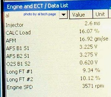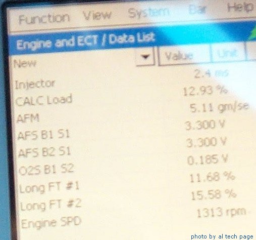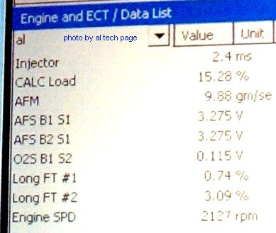 -Open or short in heated oxygen sensor (bank 1, 2 sensor 1) circuit; -Heated oxygen sensor (bank 1, 2 sensor 1); -Air induction system; -Fuel pressure; -Injector; -Gas leakage on exhaust system; -ECM (И при случае стоит "обратить внимание" на статьи о Air/Fuel Ratio Sensor внизу этой странички http://alflash.com.ua/story.htm ) But by "GENERAL 2003 FEATURES" ("To comply with the OBD-II regulations, all the DTC have been made to correspond to the SAE controlled codes. Some of the DTC have been further divided into smaller detection areas than in the past, and new DTC have been assigned to them"): The following table shows part of DTC subdivided from the old DTC. "...Old DTC P0125 -> P0134, P0154, P1134, P1154..." "New" DTC P0125 (e.g. for 3GR-FSE) had Trouble Areas: - Cooling system; - ECT sensor; - Thermostat (water inlet). Расположение "банок" двигателей Тойоты указан в ссылке из https://forum.alflash.com.ua/viewtopic.php?t=86 Следующим "клиентом" с неустойчивым ХХ, повышенным расходом, горящими лампами "Check Engine", "ABS" стал RX300 a'00 (78721 mi). Для прикола проверка проводилась не с помощью Toyota/Lexus Intelligent Tester, а NoteBook HP с ипользованием amateur "device" for ISO9141-2 Protocol and Programms OBDII Scan Tech. Посещение No.1. Коды неисправности: P0303**, P0141, P0171, P1130***. Freeze Frame: LFT#1>52%. Data List: ...; MAF (at Idle) >2.1 g/s ! С помощью "технологии witchout Scan Tool" ;-) и индикатора "ABS" считаны flash-codes 33 и 34. Неисправность АБС устранена заменой LR Wheel Speed Sensor (34) и "ремонтом" разъема RR Wheel Speed Sensor (33). MAF Sensrs оказался более чем "грязным" и очищен. LFT уменьшился до 18%, но MAF стал криминально большим (3.95-3.97 g/s !) Сделан "Clear Memory" и авто отправлено для выполнения "drive pattern to run and complete all AVAIL monitors (Readiness Test to COMPL)" для последующей проверки их состояния (PASS or FAIL) и анализа данных в режимах as know Mode#1,#5,#,#6,#7. Например, для кислородных датчиков (TID: Time$04 = Oxygen Sensor Heater; CID: $07, $08, $81, etc.)