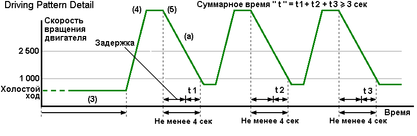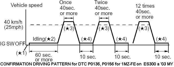 (1) Start the engine, and warm it up until the ECT reaches 75?C or higher. (2) Drive the vehicle at 55 mph (88 km/h) or more for at least 10 minutes. (3) Change the transmission to 2nd gear. (4) Accelerate the vehicle to 55 mph (88 km/h) or more by depressing the accelerator pedal for at least 10 seconds. (5) Soon after performing step (4) above, release the accelerator pedal for at least 4 seconds without depressing the brake pedal, in order to execute fuel-cut control. (6) Stop the vehicle and allow the engine to idle for 10 seconds or more. (7) Allow the vehicle to decelerate until the vehicle speed declines to less than 6 mph (10 km/h). (8) Repeat steps from (4) through (7) above at least 3 times in one driving cycle. (9) Check the Readiness Monitor status displayed on the Scan Tool. (10) If the status does not switch to COMPL (complete), make sure that the preconditions have been met, and then perform steps from (2) through (8) in Drive Pattern above.