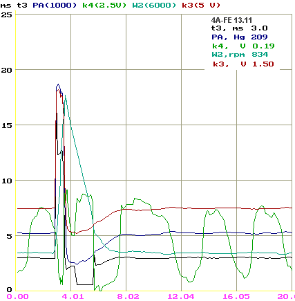 На рис.6 ХХ двигателя 4A-FE (показаны значения параметров во времени в течение 20 сек, каждый параметр - своим цветом):