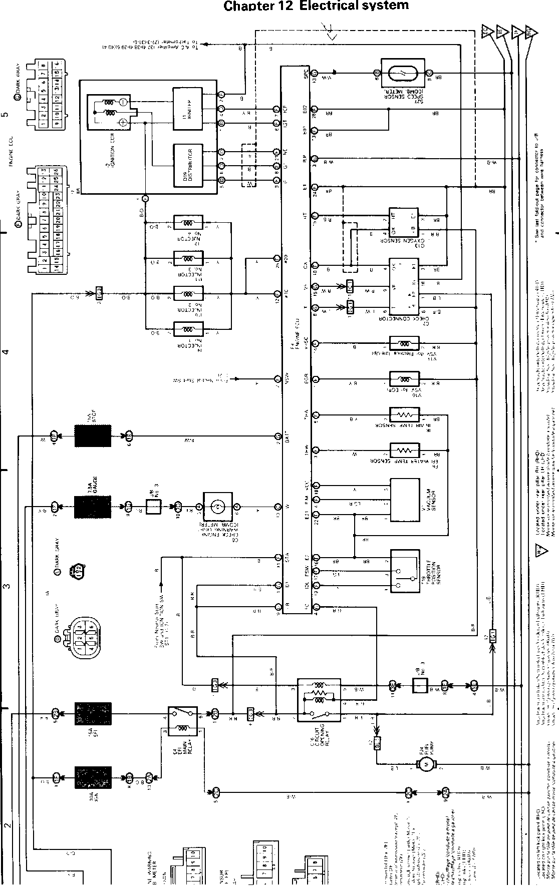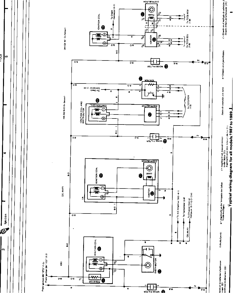 Есть отличия в реализации системы зажигания. В распределителе двигателя 4A-FE обедненной смеси расположены только датчики положения и вращения, т.е. в нем отсутствует коммутатор и катушка и в крышку трамблера вставляется пять свечных проводов, и коммутатор размещен отдельно. "Схема" подключения ECU (один из возможных вариантов).