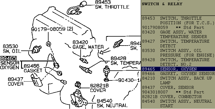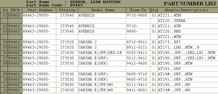 Достоверное определение типа инжекторной системы и, соответственно, типа датчика кислорода возможно только по VIN-коду автомобиля или, в крайнем случае, по году выпуска и типу кузова (например, для "Carina E" '92-'96 см. рис. Parts No). Как следует из рисунка, возможен вариант, при котором оба типа датчиков могут быть установлены в одном месте выпускного тракта.