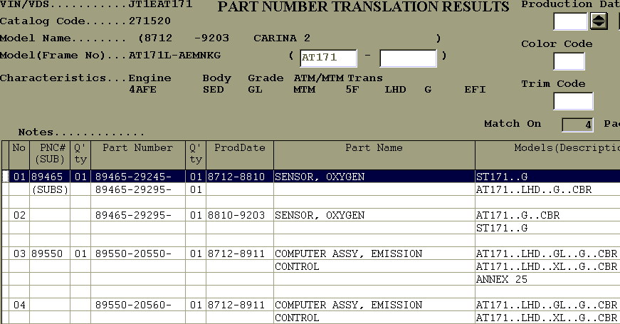 Для "Carina2" '87-'89 следует, что в зависимости от даты выпуска автомобиля на них устанавливались датчики кислорода и ECM с разными Part Number.