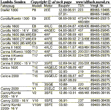 Здесь приведен список Part Number, Model Name, From-To для Sensor Lean Mixture 4A-FE. Столь ощутимая разница в цене (100$ и 240$) объясняется отличиями в принципах работы и конструкцией. Таблица применямых TOYOTA Лямбда-зондов.