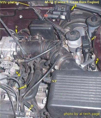 (TPS); 3 - диагностический разъем (DLC No.1); 4 - коммутатор (Igniter); 5 - клапан ХХ (ISCV); 6 - датчик температуры двигателя (ECT); 7 - датчик температуры воздуха; 8 - датчик температуры; 9 - регулятор давления в топливной системе. |