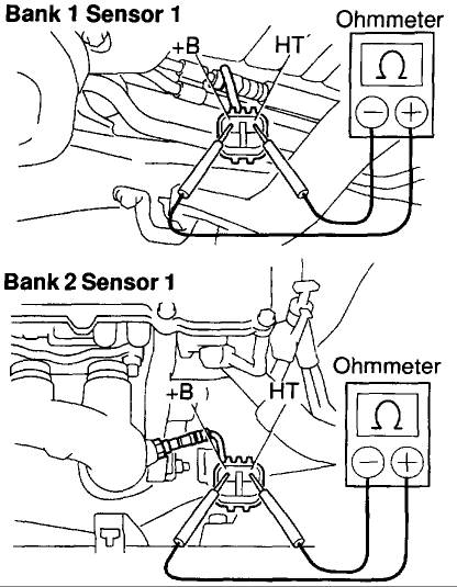 b) Using an ohmmeter measure the resistance between terminals +B and HT. Resistance: 0.8 - 1.4* ohms at 20°C (68°F). If the resistance is not as specified, replace the sensor.