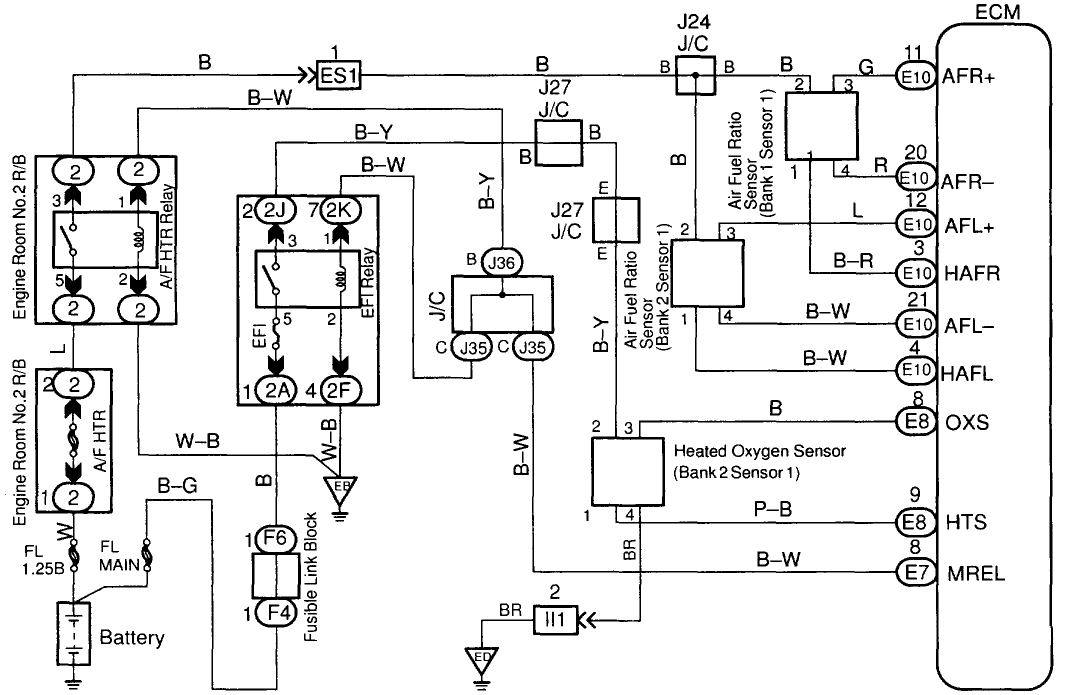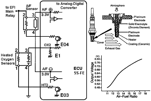The A/F sensor contains a ECU-controlled heater. At start-up, the heater helps warm the A/F sensors to quickly operating temperature. With minimal exhaust gas flow, the heater keeps the A/F sensor from cooling down.