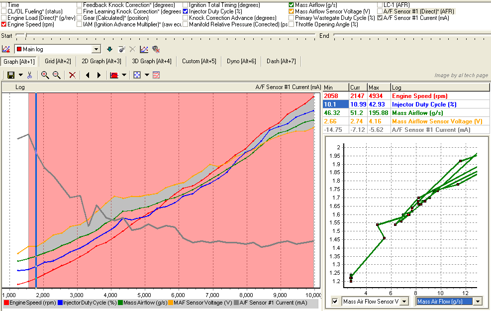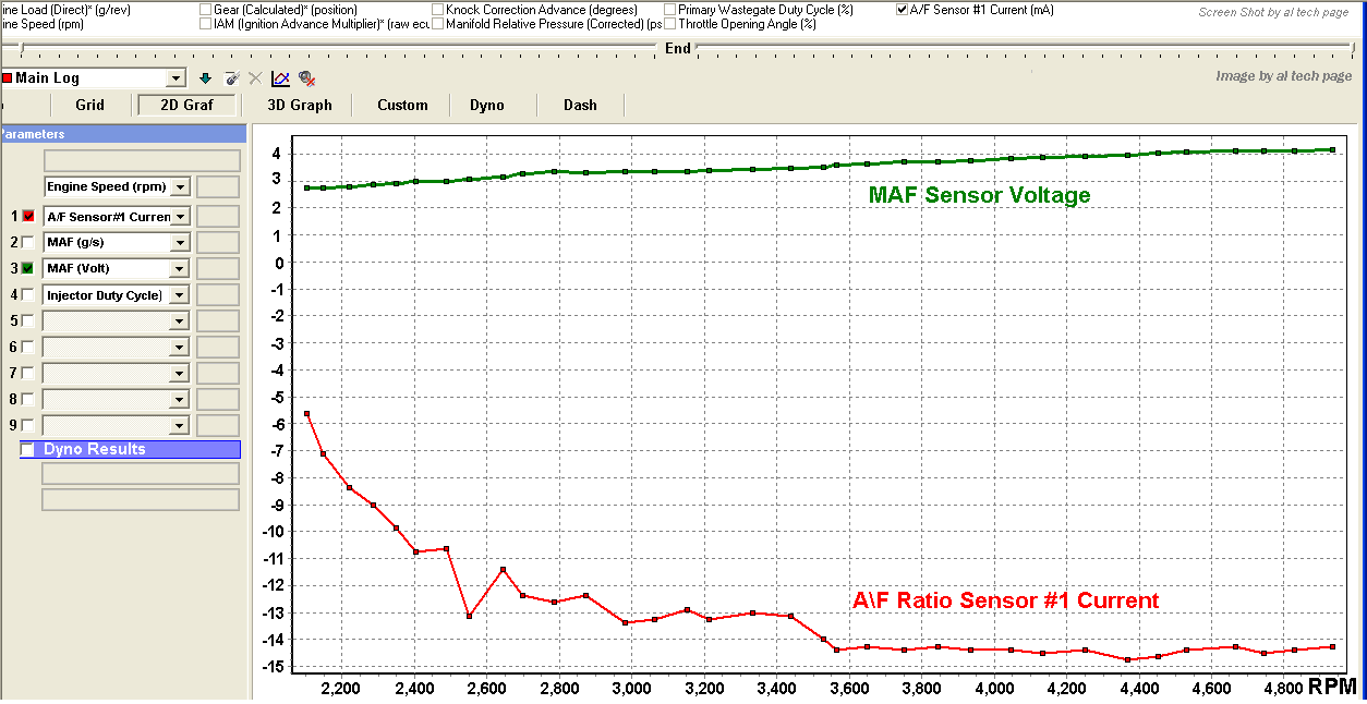 The voltage shown on the chart is what one would see if one were using the factory Toyota scan tool to measure the A/F sensor parameter. Toyota states that the output of this sensor can only be measured with a scan tool. (It appears that the Toyota factory scan tool and the Vetronix Mastertech with the Toyota OE software are the only tools that support this parameter currently). This is not true! Besides, on Engines with these Sensors voltage that corresponds with a specific A/F ratio is above (to 4.0 Volts).