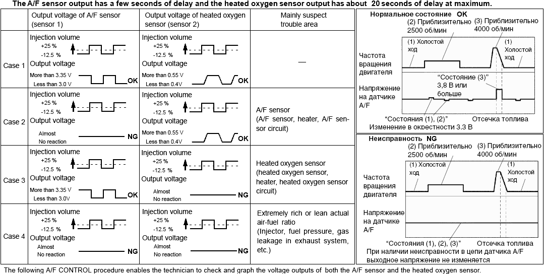 Result: Air fuel ratio sensor and oxygen sensor reacts in synchronizing with increase and decrease of injection volume (For HO2S: +25 % " rich output: to 1 V, -12.5 % " lean output: to 0 V)