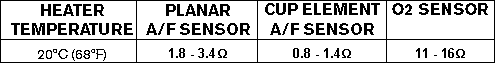 The heater resistance for the planar AF sensor is slightly higher than the cup element A/F sensor. Heater resistance is checked with a DVOM. A characteristic of this AF sensor is that when it fails it can drive the A/F signal output high or low causing a rich or lean condition.