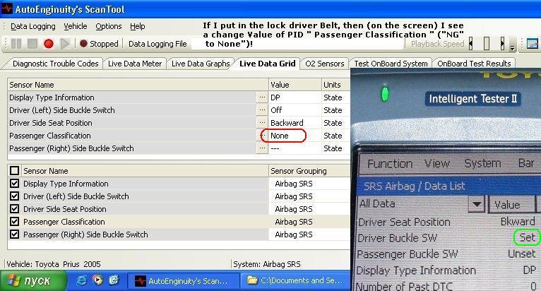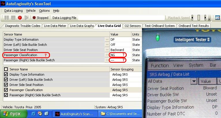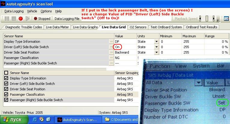 I've again checked AE* on Prius a '05 and try did Diagnostic SRS. Note. I use Documentation 2005 PRIUS REPAIR MANUAL (RM1130U) and AEs "scantooluserguide". I not used others "devices" in this episode. For the checking (for Authenticity of results) I used separate another scanner (IT2 by Denso) and had a good and correct Results. I've performed such functions as reading the values of switches and sensors: AE report: "Display Type Information is DP" (The display is indicated by Driver/Passenger). 1. In "Live Data Grid" I see ("Sensor Name" / "Value"):Passenger (Right) Side Buckle Switch / "..." (I don't understand "Value="...") Here take a look at the differences in PIDs between the AE (the Lying) and IT2 (real and correct Data). Notice a difference
