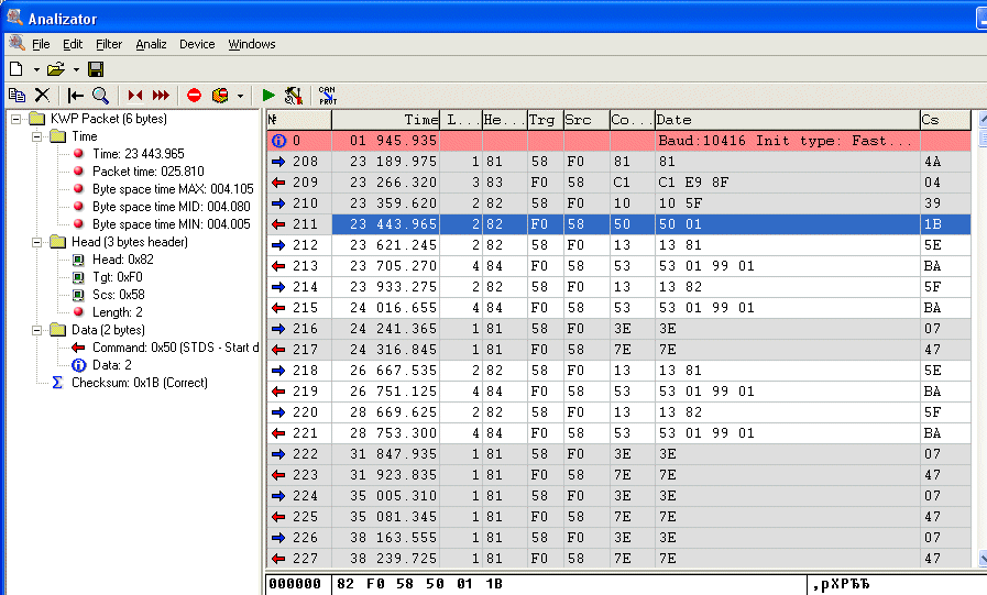 Open KWP2000 Baud: 10416 Init type: Fast init kw1: 0xE9 kw2: 0x8F Trg: 0x58 Src: 0xF1 ... 58 F1 81 58 F1 81 4B F1 58 83 F1 58 C1 E9 8F 05 58 F1 81 58 F1 81 4B F1 58 83 F1 58 C1 E9 8F 05 58 F1 82 58 F1 21 04 F0 F1 58 86 F1 58 61 04 02 02 01 01 3A 58 F1 81 58 F1 81 4B F1 58 83 F1 58 C1 E9 8F 05 58 F1 82 58 F1 21 04 F0 F1 58 86 F1 58 61 04 02 02 01 01 3A 58 F1 81 58 F1 81 4B F1 58 83 F1 58 C1 E9 8F 05 58 F1 82 58 F1 21 04 F0