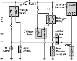 Этот клапан управляется сигналами ECM и непосредственно переключателями "габариты" ("Tail"), обогрев заднего стекла и т.п. Таким способом осуществляется подача дополнительного воздуха во впускной коллектор, что увеличивает скорость вращения двигателя и компенсирует дополнительную нагрузку.