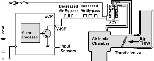 Эта система регулирует воздушный поток "мимо" дроссельной заслонки, используя управляемый ECM клапан Air Control Valve (ACV).