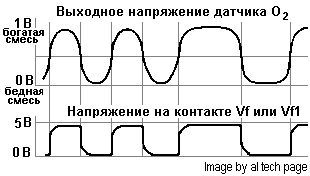 If the ECM is decreasing the amount of fuel that it thinks should be normally used, it will output a lower voltage (either 1.25 volts or 0 volt) on the Vf terminal. This will happen when the ECM is compensating for a rich condition.