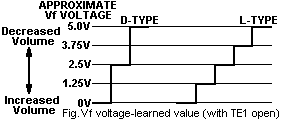 Using Vf (TE1 Open) When in the diagnostic mode (TE1 grounded), voltage at the Vf terminal should move from 0 volt to 5 volts to indicate that the feedback system operating and the ECM is continually fine tuning the injector pulse width to keep the air-fuel ratio centered at about 14.65:1 The Vf voltage when TE is open tells you how much correction has been necessary to the basic injection duration to maintain that air-fuel ratio. It will range from volt to 5 volts, with the number of steps depending on the type of airflow metering used (figure). D-type fuel injection systems (which have a pressure sensor instead of an airflow sensor) use only 3 voltage steps: 0 volt, 2.5 volts, and 5.0 volts. The 2.5-volt normal voltage covers rich or lean fuel correction of up to 10 percent. A 0-volt or 5-volt reading has the same meaning as it does on L-type injection systems. The Vf terminal provides information on the amount of correction the ECM is making while the engine is operating (table). The ECM compares the amount it is correcting the air-fuel ratio to a set of programmed values. If the amount of correction is within its normal range, the ECM puts about 2.5 volts onto the Vf terminal.